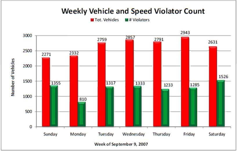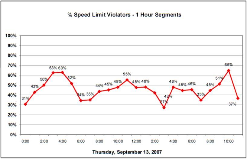 The following graphs are examples of the information available from SpeedPanel. The information is useful in focusing law enforcement effort on the right locations and at the right time of day for effective traffic management.